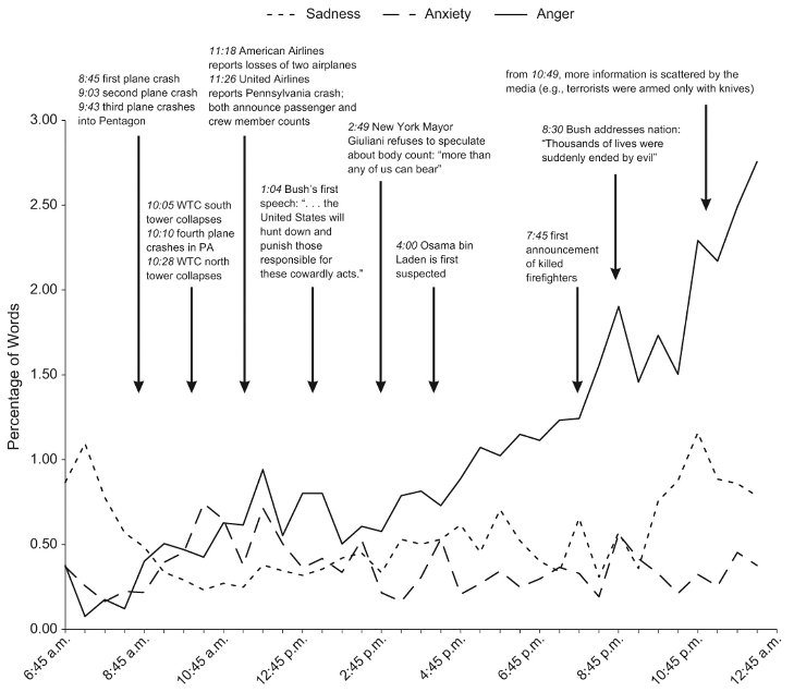 The graph below records levels of sadness, anxiety and anger, in words taken from US pager messages, sent as the day of September 11th 2001 unfolded. The analysis is reported in a study just published in Psychological Science. Click for a larger version of the graph.