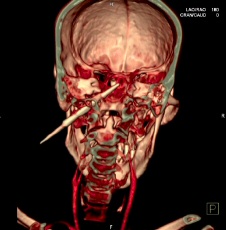 The image is a 3D CT scan of someone who was shot in the head with an arrow which penetrated their brainstem.