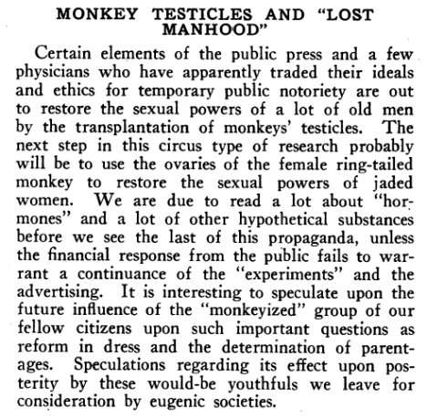Monkey testicles and lost manhood A sceptical report on the value of transplanting monkey testicles into humans in an attempt to “restore the sexual powers of a lot of old men” from a 1921 edition of the California State Journal of Medicine. Link to article in PubMed. Share this: Click to share on Facebook (Opens in new window) Facebook Click to share on X (Opens in new window) X Click to share on Reddit (Opens in new window) Reddit Click to share on X (Opens in new window) X Like Loading... Related
