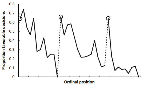 The graph looks at the proportion of rulings in favor of parole by ordinal position (so 1st case of the day, then 2nd, then 3rd, etc). The circled points are the first decision in each of the three decision sessions, the tick marks on the x-axis denote every third case and the dotted line denotes a food break. The probability of the judges granting parole falls steadily from around 65% to nearly zero just before the break, before jumping back up again after they return to work.