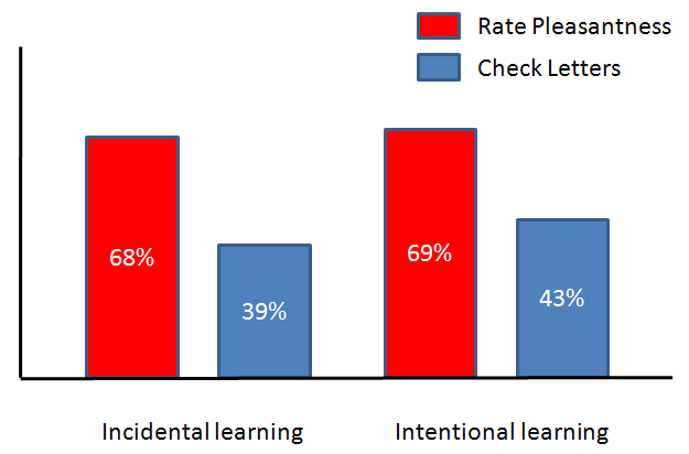 A classic experiment by Hyde and Jenkins (1973) illustrates this. These researchers gave participants lists of words, which they later tested recall of, as their memory items. To affect their thinking about the words, half the participants were told to rate the pleasantness of each word, and half were told to check if the word contained the letters ‘e’ or ‘g’. This manipulation was designed to affect ‘depth of processing’. The participants in the rating-pleasantness condition had to think about what the word meant, and relate it to themselves (how they felt about it) – “deep processing”. Participants in the letter-checking condition just had to look at the shape of the letters, they didn’t even have to read the word if they didn’t want to – “shallow processing”. The second, independent, manipulation concerned whether participants knew that they would be tested later on the words. Half of each group were told this – the “intentional learning” condition – and half weren’t told, the test would come as a surprise – the “incidental learning” condition.